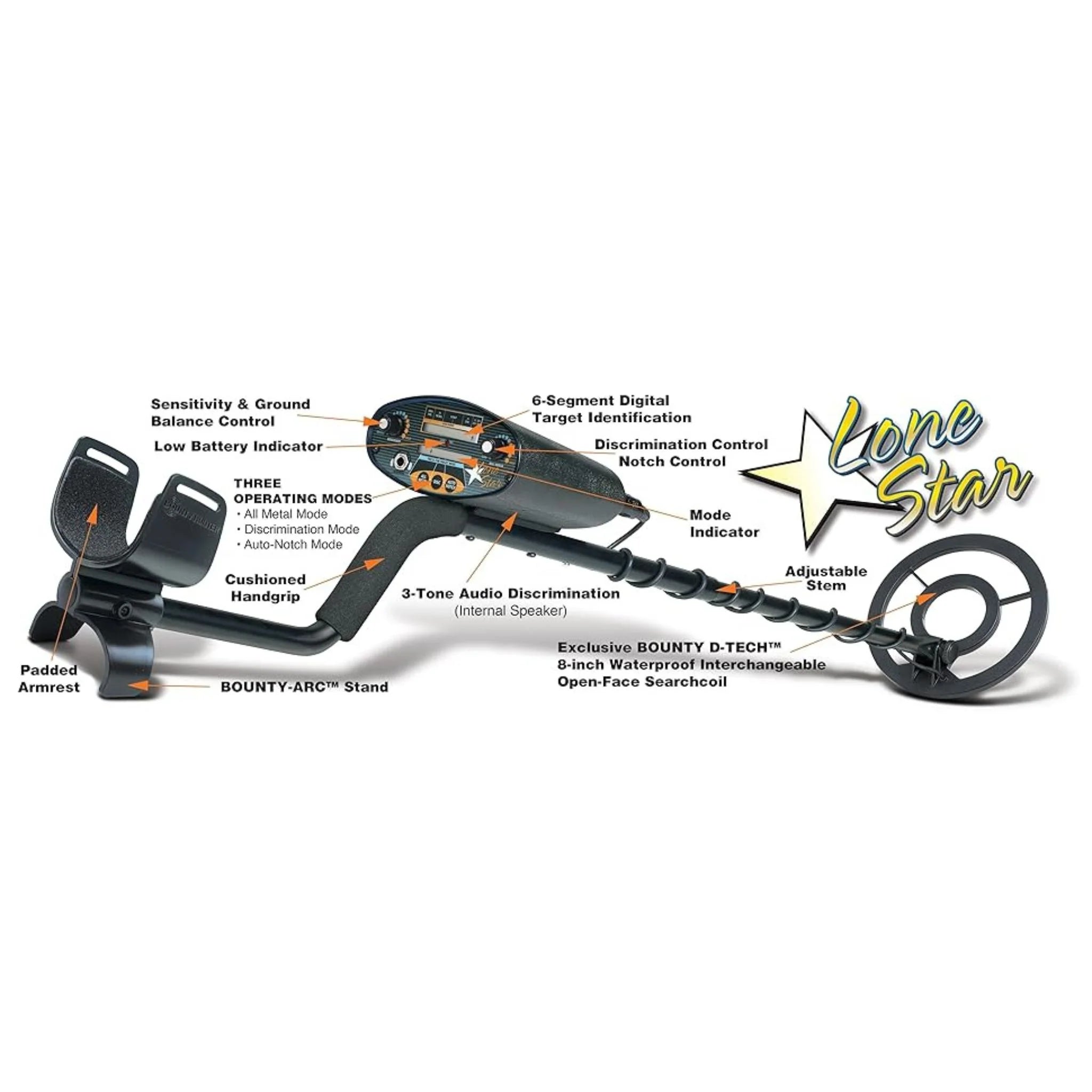 The Bounty Hunter Lone Star is a general-purpose metal detector designed for coin shooters, relic hunters, and hobbyists of all experience levels. Whether you're exploring parks, fields, or beaches, its advanced microprocessor-controlled system and simple interface make it ideal for users seeking reliable performance with minimal setup.